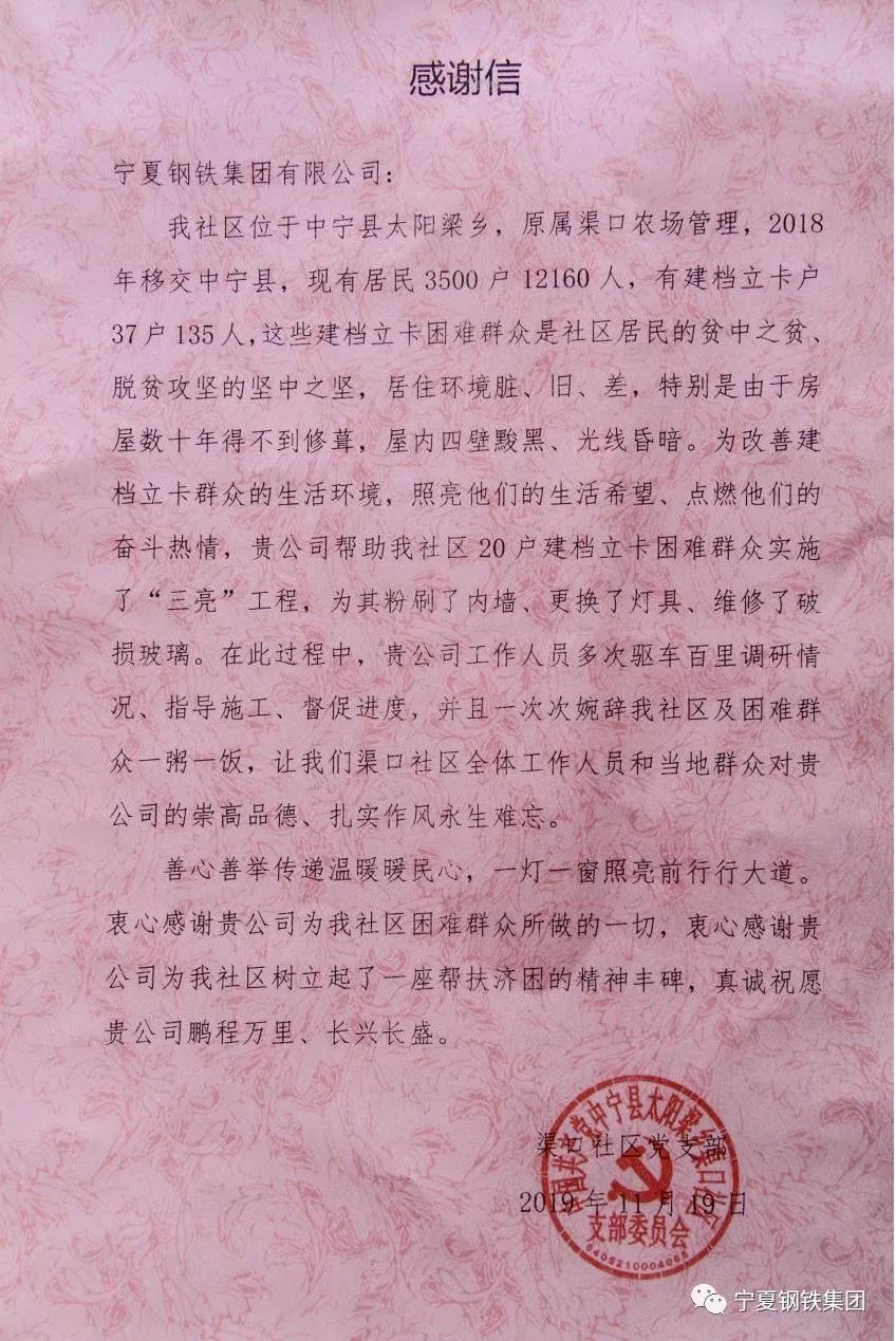 近日,寧夏鋼鐵(集團(tuán))有限責(zé)任公司(以下簡(jiǎn)稱“寧鋼集團(tuán))工會(huì)在中衛(wèi)市中寧縣太陽(yáng)梁鄉(xiāng)渠口社區(qū)開(kāi)展“三亮”工程,幫助該社區(qū)內(nèi)20戶建檔立卡困難群眾改善生活居住環(huán)境。