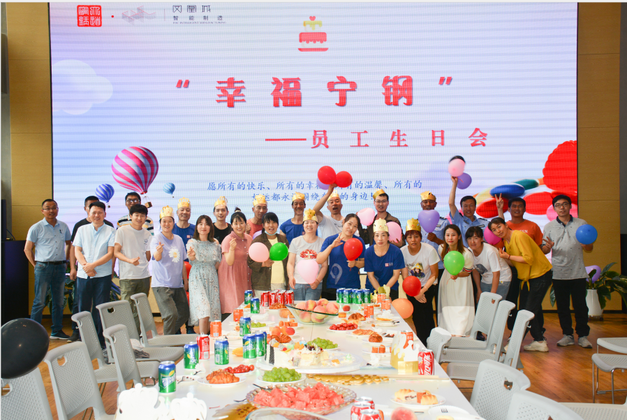 為感謝員工的辛勤付出和努力,豐富員工精神文化生活,增強(qiáng)員工歸屬感,深切感受公司大家庭的溫暖。6月30日下午寧夏鳳凰城智能制造有限公司迎來了首屆“幸福寧鋼”員工生日會。隨著現(xiàn)場優(yōu)美歡快的音樂,26位壽星,歡聚一堂,共享歡樂。